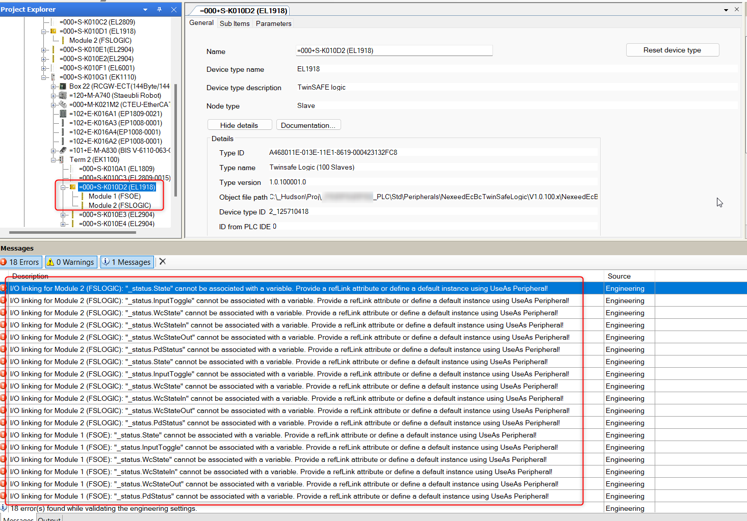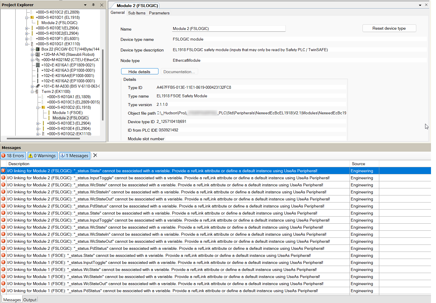 After the object EL1918 of Beckhoff is scanned from the TwinCAT, the CPS has several errors, I do not understand what it is meaning. Please see the attachments, thank you~